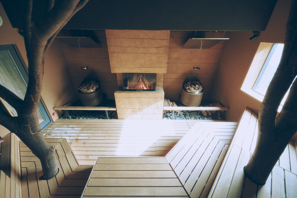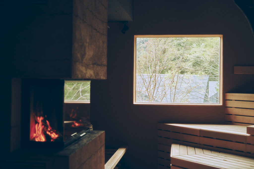 ぜいたくに2つのサウナストーブが設置されているため、サウナ室内はまんべんなくあたたかく、ちょうどいいセッティングに。中央の暖炉には薪がくべられて、燃え上がる炎、薪がはぜる音、炎のゆらぎで、五感を通して“ととのいの向こう側”へと誘ってくれます。