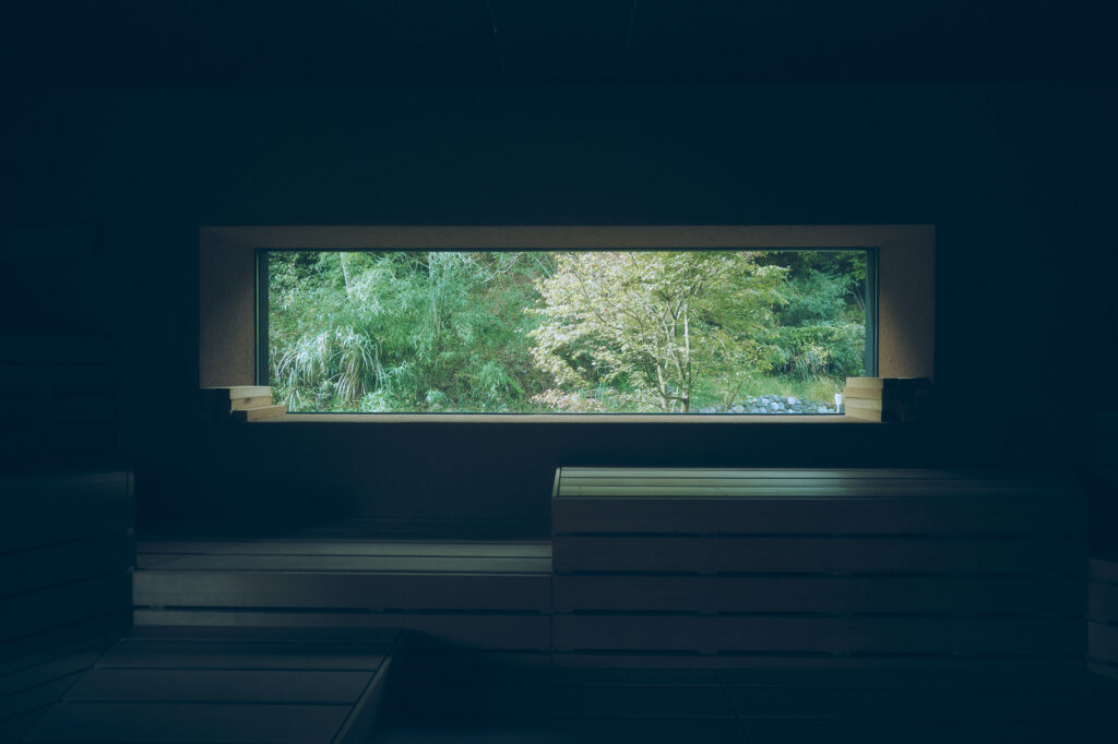 サウナ室の大きく切り取られた窓からは、里山の自然が一望できます。四季折々の景色、時間帯によって変わりゆく表情。里山の稜線、揺れる緑、差し込む光──。景色を眺めながら蒸される時間は、まさに“自然と一体になる”体験そのものです。