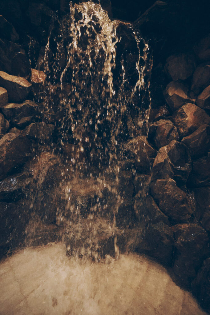 山サウナとはうってかわって違う趣なのが、滝サウナ。「滝ってどういうことだろう……?」とワクワクした気持ちで、サウナ室の扉を開けます。中はひんやりした空気と、水音のレイヤー。まるで洞窟のようです。