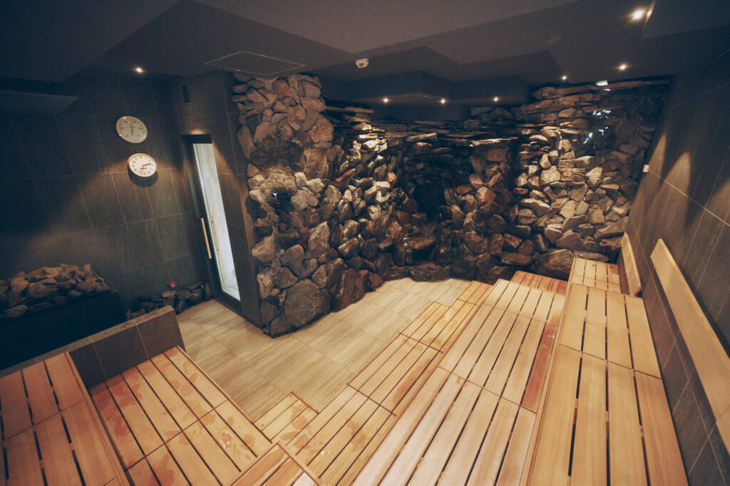 サウナ室の壁は自然の岩で形作られ、マイナスイオンたっぷり。その岩肌を伝い、ぽとん、ぽとんと落ちる里山の天然水が、室内をやわらかな湿度で満たしていきます。
