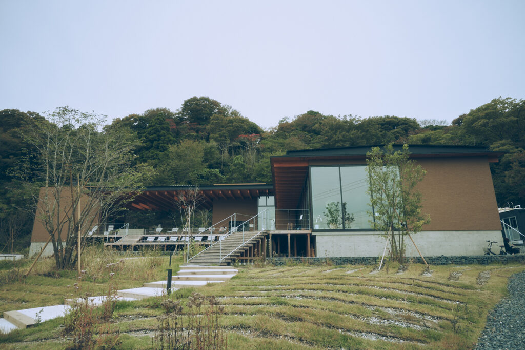 富津中央ICから車で約15分。首都圏からも車でおよそ60分とアクセスがよく、JR内房線「上総湊駅」からはタクシーで約10分。のどかな里山に広がる風景の中に、ふいに現れるスタイリッシュな建築、それが「SATOYAMA TERRACE」です。穏やかな緑の中にぽっと浮かぶ現代的な佇まいは、里山の空気と美しい建築が溶け合い、一度見ると忘れられない存在感があります。