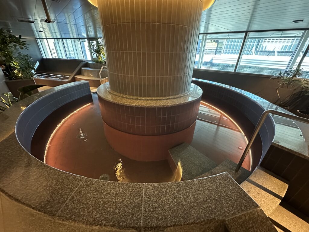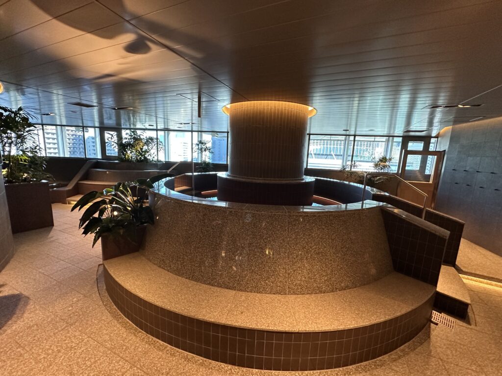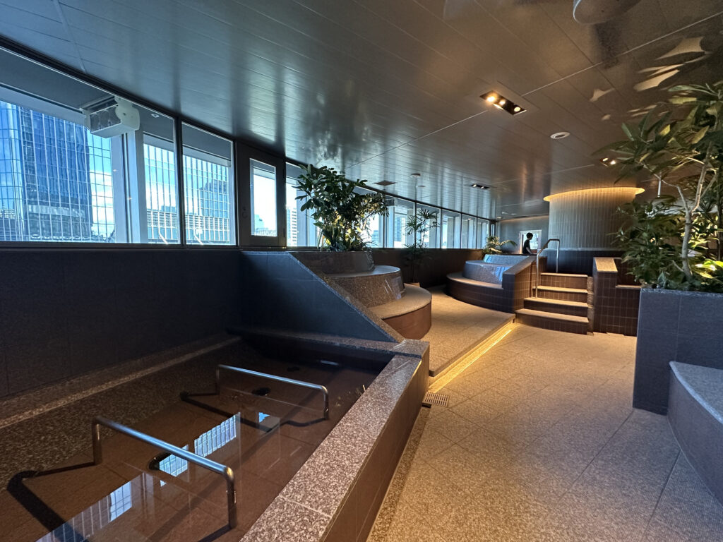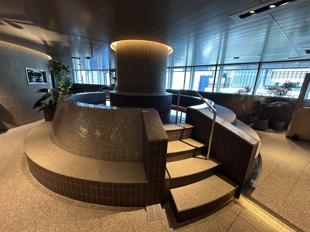 柱を軸に円を描くような形の水風呂。そしてその周りには休むことができるように、と腰がかけられる設計に。空間を無駄にしない作りです。窓からは都会の景色も。日中はやわらかい日の光を浴びながら、夕景ではビルがキラキラと輝く様子を眺めながら思い思い過ごし方ができそうです。