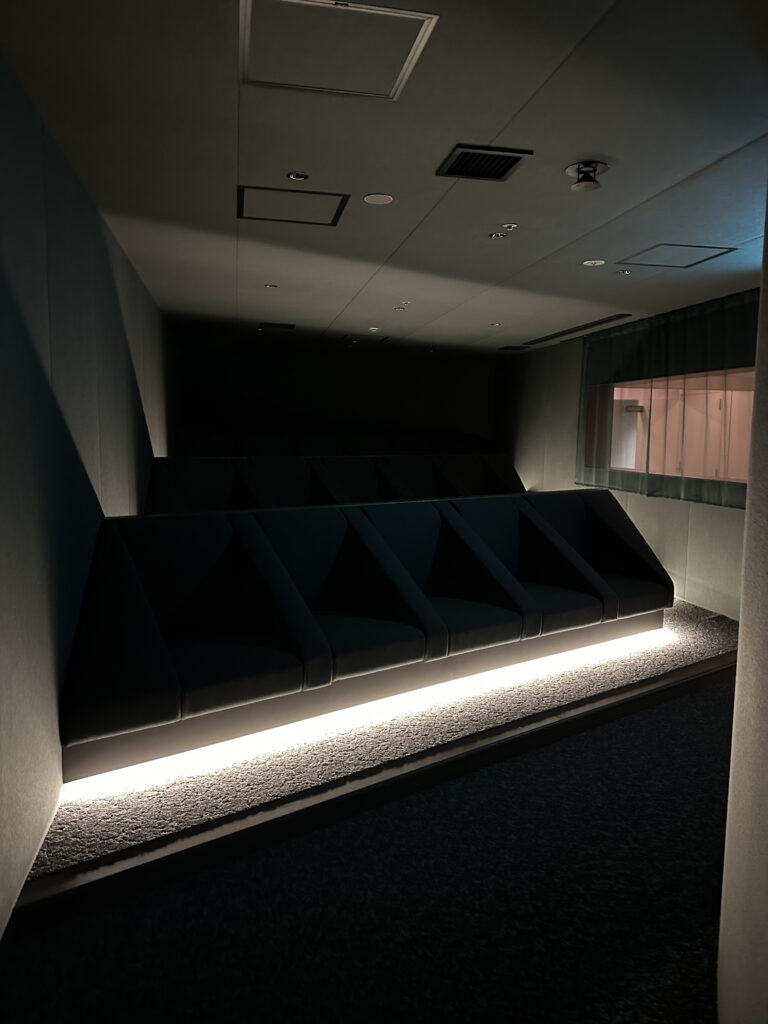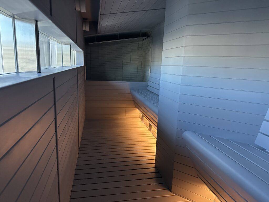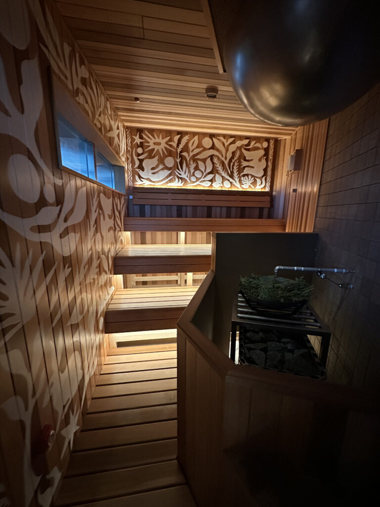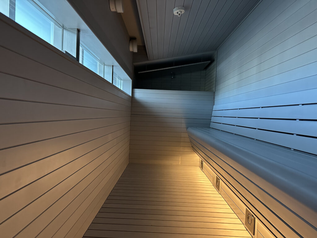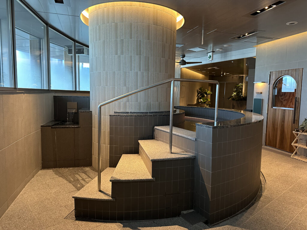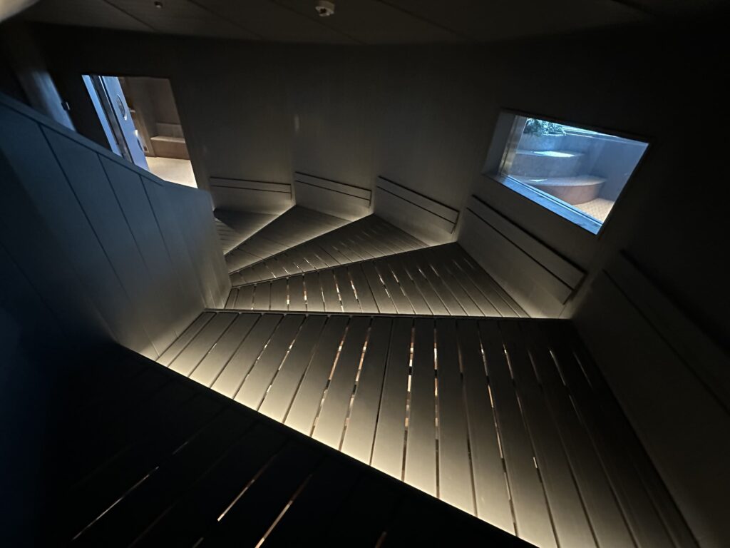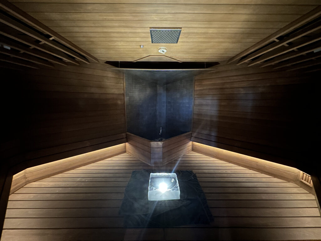 プログラミングされた水の波紋が天井に広がっていてなんとも美しい光景。このような作りのサウナ室は日本では見たことがなく……圧巻ですよね。