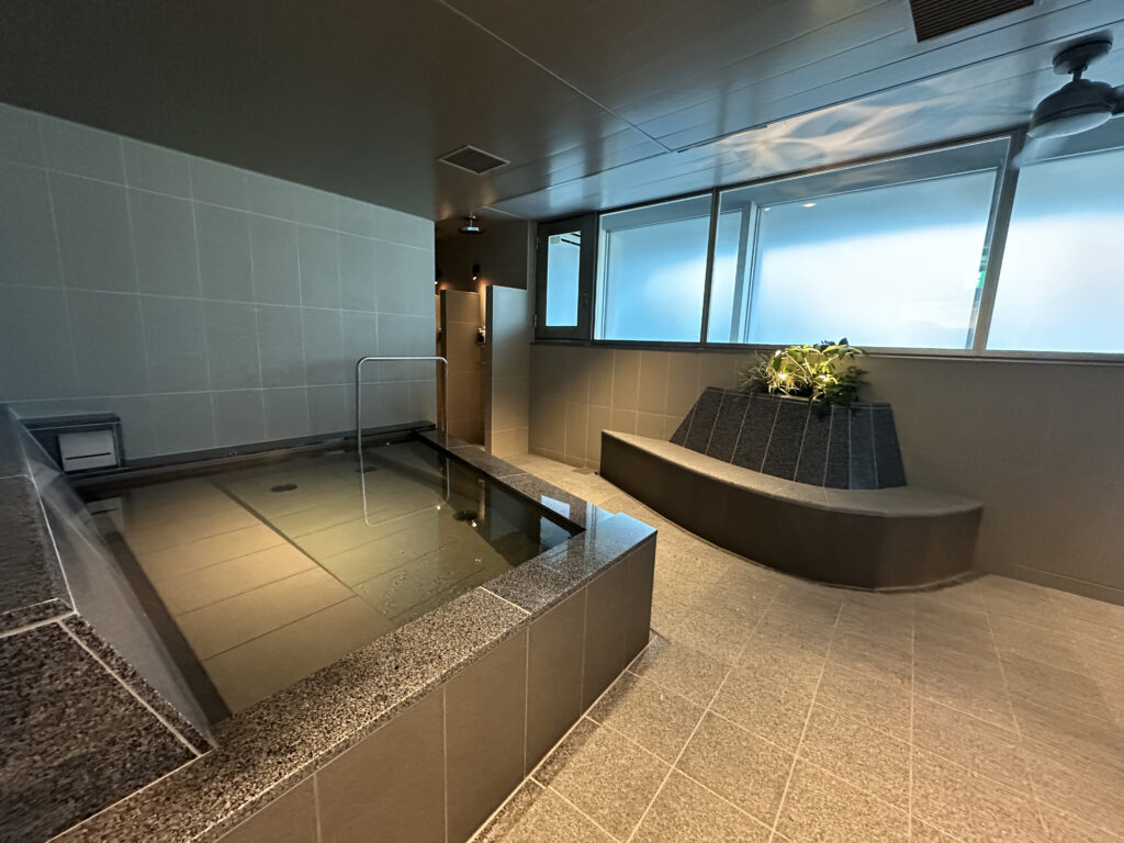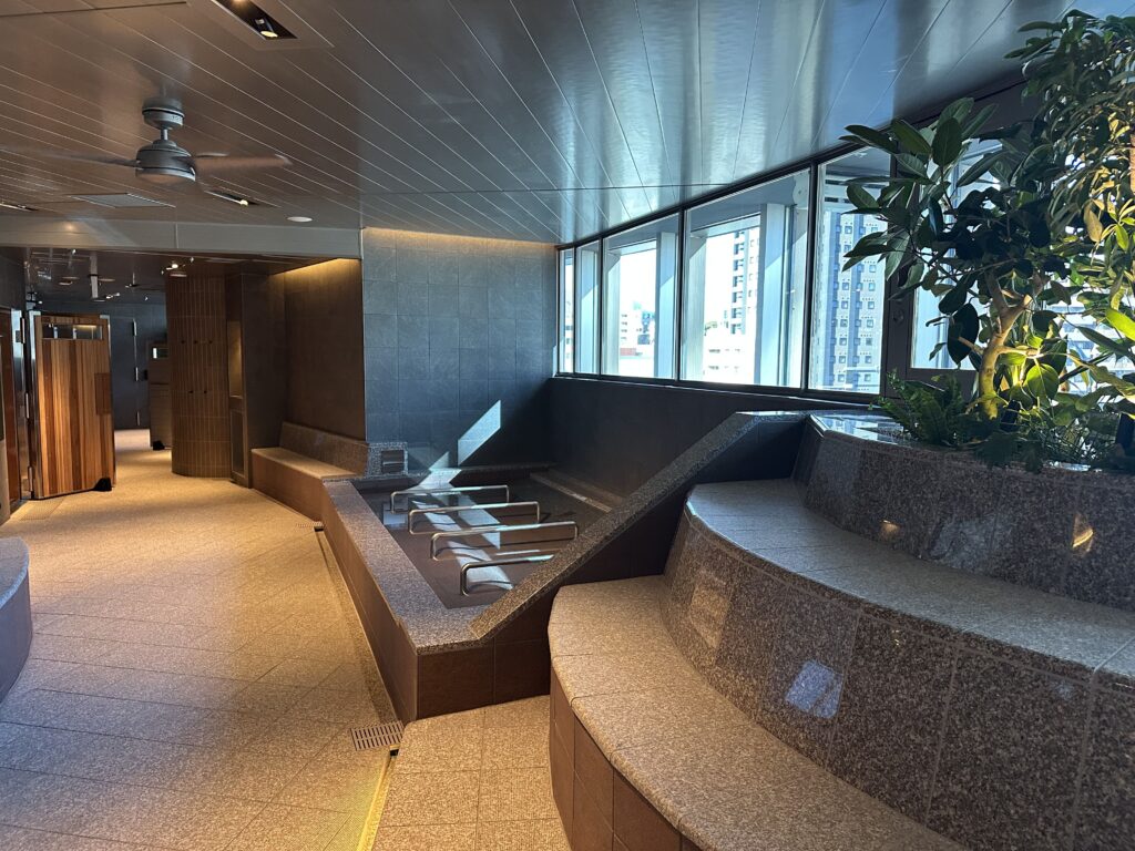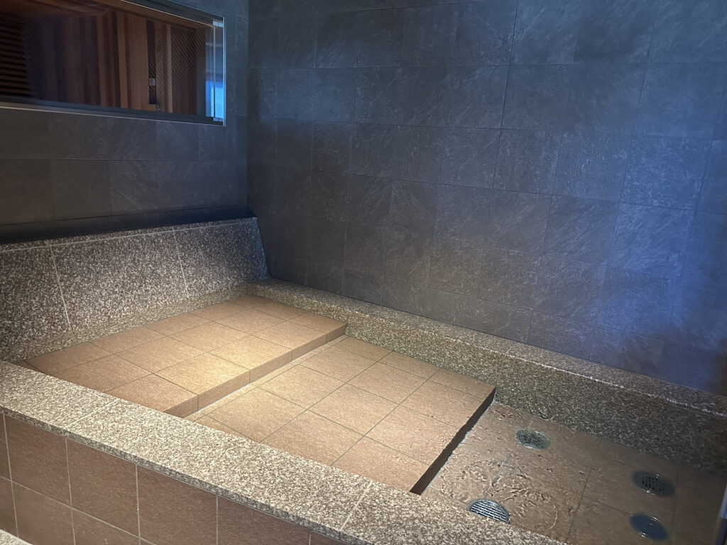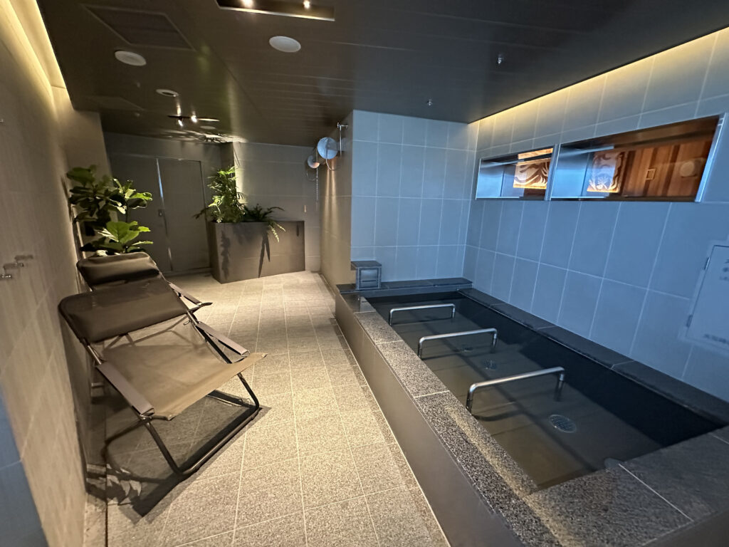 浴室に入ってすぐにも水風呂はあるのですが、こちらは「寝水風呂」。頭を預けて、横になって体を冷ますことができます。さらに、温かい浴槽も完備。至る所に休憩スペースも設けています。