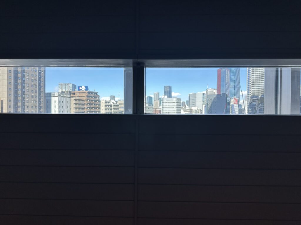 パノラマウィンドウが楽しめるように、と座面はかなり高い作りに。座ってみると、足がつかない! 地に足がつかない……自然と揺れてしまう足と……新しい体感。サウナ室から見るビル群……不思議とぼーっと眺めてしまうものです。時間と共に変わりゆくその表情にも注目です。