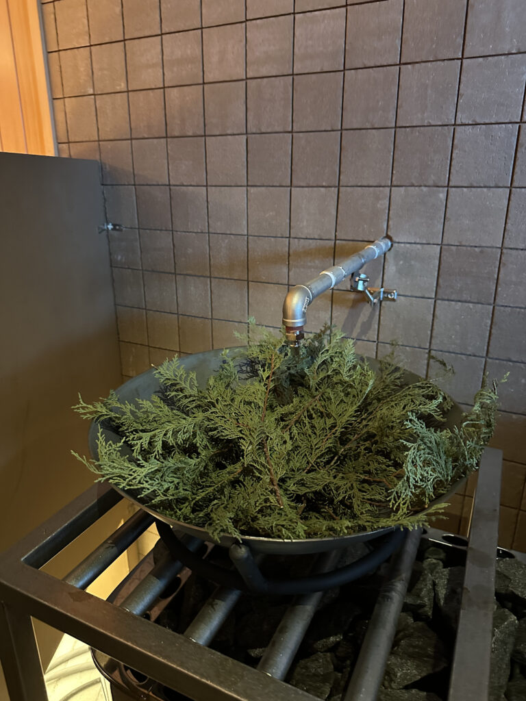 フレッシュハーブや季節の香りに蒸気と共に包み込まれるハーバルに特化した「Leaves」。このサウナ室にも、壁面にはエッセンシャルオイルを拡散する秘密の装置が完備されています。