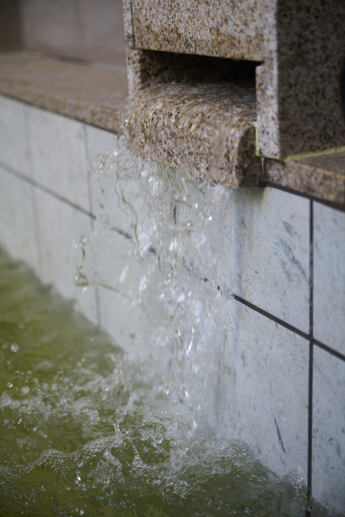 全館、地下水を使用しています。もちろん浴室内の水風呂とハーブの香りが楽しめる浴槽「彩り湯」、露天風呂も。やや薄緑な色合いが肌あたりのまろやかさを掻き立たせてくれます。