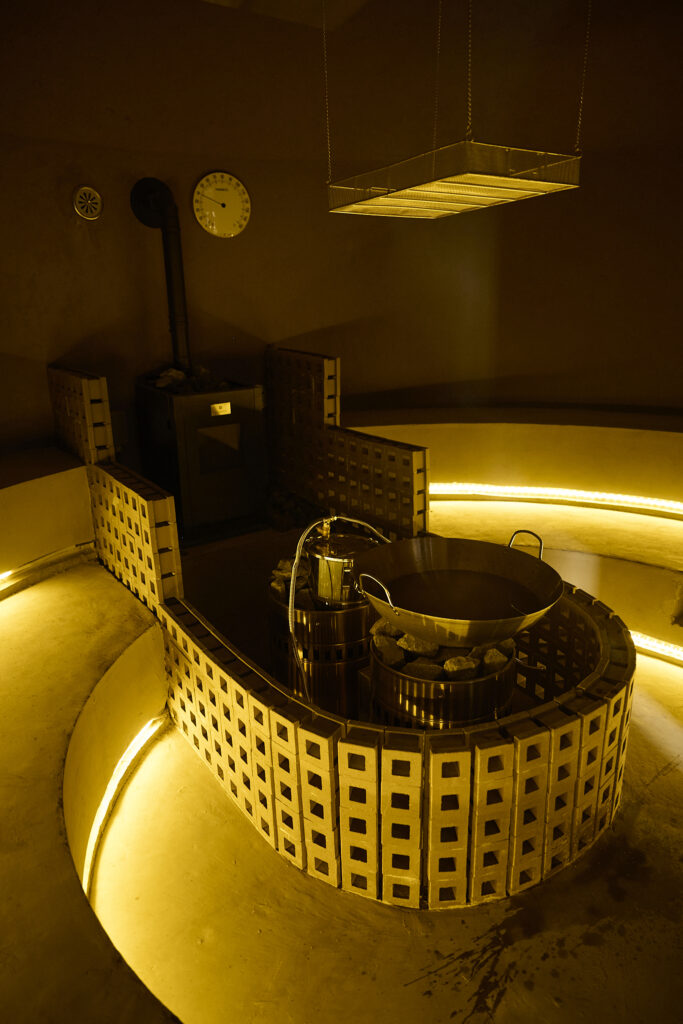 少しかがみながら入る洞窟型サウナ室内の中央に、煌々と炎が光るペレットストーブが。黙々とサウナ室内を温めてくれるだけでなく、ペレットが燃えるカラカラとした音もまた気持ちよさを倍増させてくれます。