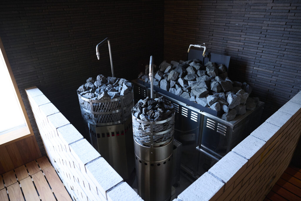 座面が5段の広々としたサウナ室には、3基のストーブが鎮座。