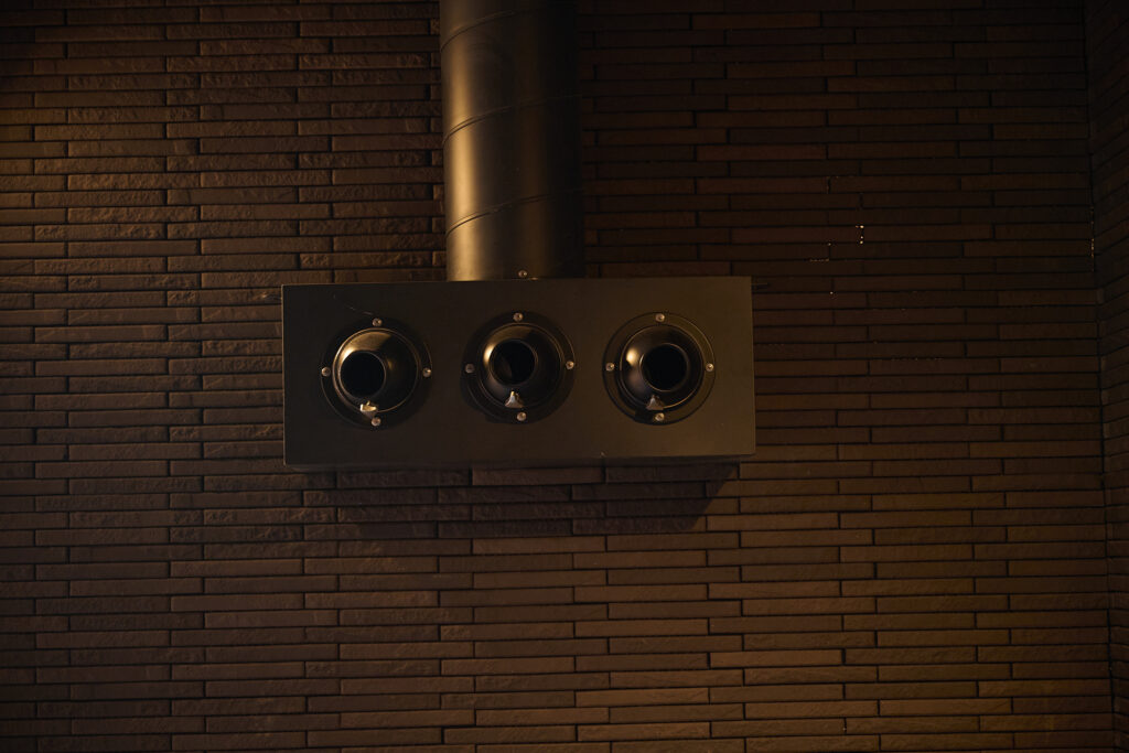それでだけでなく、送風機も。パワフルな熱と蒸気を室内全体に広げてくれます。それにしても、この3基のストーブは迫力がありますよね。こんなに広々とするサウナ室をアチアチにするんだから……納得です。