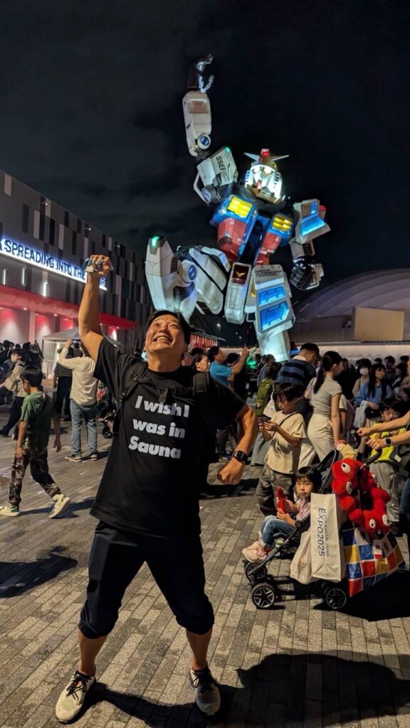 僕自身、「万博」と呼ばれるものに触れるのは、1985年「つくば万博」以来、40年ぶり。あの時はまだ中学生で、学校の友達と電車に乗ってつくば万博へ行って「4〜5時間待ち」が当たり前のパビリオンに並んだっけ。結局、3つくらいしかパビリオンは入れなかったけど、今でもその時の記憶があります。今回は、大阪万博に「観客」としてではなく「登壇者」として参加するわけですからね。40年前の自分にコソッと「オマエ、もっと深く万博と関わるぞ!」って教えてあげたいですよ(笑)。正直、「これが見たい」「あのパビリオンに行きたい」とか言うのは全然なくて、とにかく「大阪万博にオレは関わった」という事実を今後の「記憶」のためだけに行った感じです。小雨が降っていて、会場の外も中もどこもかしこも、超絶混んでて疲れたけど、大好きなサウナの話を沼田さんネットワークで日本中から集まった、サウナ大好きなメンバーと共に大阪万博という舞台で体験させてもらえたのは、一生の思い出になります。沼田さん、キーーートス!