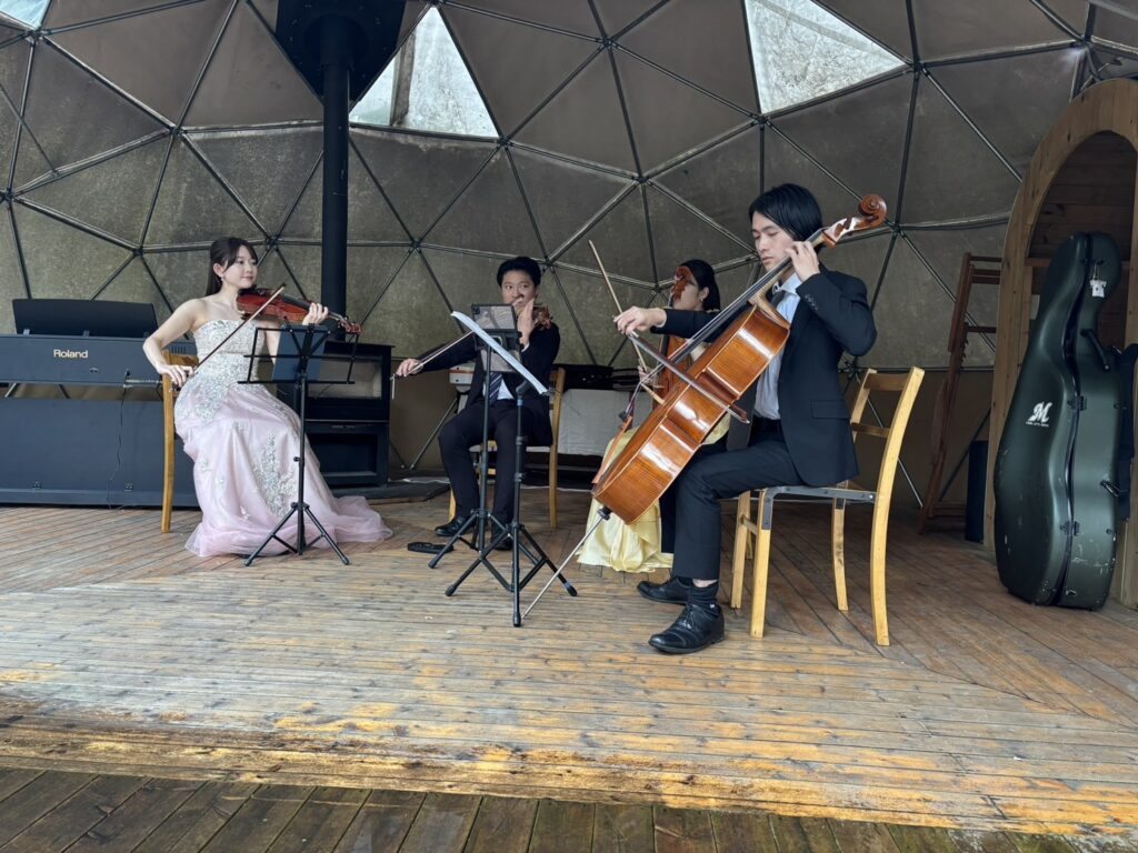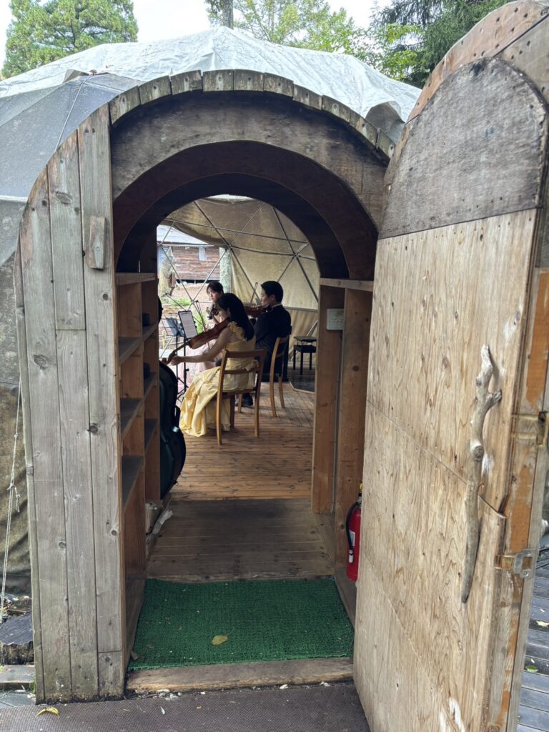 空はどんより鉛色で少し肌寒く、時より小雨降る感じでしたが、逆にこのシチュエーションが、よりクラシック生演奏を際立たせていました。そして何より、喧噪から離れ、木々に囲まれたThe Saunaのロケーションがもう合わさってこれでもかと、ぜいたく気分が増長されます…。あぁ~丁寧に紡がれた美しい言葉で魅了できる宮沢賢治、谷崎潤一郎の表現力がほしい! これは、その場で体感した人しか分からない世界線ですわ。
