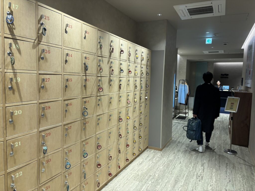男性スペースの3階に上がると清潔&おしゃれな受付前に、ランニングシューズの貸し出しとランナーのためのロッカースペースが。機能としてランニングステーションも兼ねているのね。国立競技場まわりはジョギングしている人多いですもんね。ジョギングで汗かいた後に、そのまますぐサウナでまた汗かいて温冷交代浴できるって、天国じゃん!