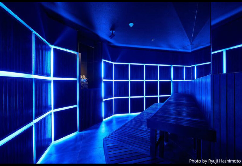 向かって左側にある高温サウナは低温サウナと打って変わって「青」のライト。スターウォーズに出てくる、ビームサーベルのような青色発光するライトが壁面に設置されており、こちらは未来空間のような感じですね。SFの世界にサウナが登場するとしたら、こんなサウナ室なんではなかろうか。座面は2段あり、上段はしっかり熱いです。サウナって「体」で熱を感じて、施設によってはBGMを流して「聴覚」からも刺激を与えますが、TOTOPAの低温、高温サウナは「視覚」からも脳を刺激してきます。一般的に「赤」は熱いイメージ、「青」は冷たいイメージじゃないですか。それなのにTOTOPAでは低温が「赤」、高温が「青」なのも興味深い。熱い「青」空間って、なんか熱さが「キリッ」としてる感じがします。青色空間にいることで、脳を誤認識させているんですかね。