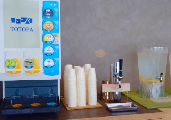 まず、脱衣して浴場に入る前室的なスペースに「ドリンクコーナー」が設置されています。サウナ施設といえば冷水器があるのは当たり前ですよね。冷水器以外から水分補給するには自分で麦茶やポカリ、イオンウオーター等のペットボトルを持ち込み、もしくはフロントで購入、みたいなパターンが一般的です。「サウナ東京」は、施設利用料とは別料金支払って浴場内ドリンクを有料でいただくパターンもあります。しかし、しかし、TOTOPAの場合、このドリンクコーナーの飲物は施設利用」に含まれており、無料。そしてドリンクの種類なんですけど、①レモン水、②ウーロン茶、③デカビタC、④DAKARA、⑤DAKARA炭酸、⑥デカビタCとDAKARAを割った「デKADA」がフリー飲み放題! そして驚愕だったのが、⑦サントリー「オールフリー」ビールのビールサーバーも設置されていてビールも飲めちゃうんですよ(もちろんノンアルですけど)。7種類のドリンクが利用時間内すべて飲み放題というのは、アマノは初だったんですが、サウナ→水風呂→休憩の1ターンの中に「次は何飲もうかなー」という「給水」の楽しみが新たに加わり、これは新感覚でしたね。