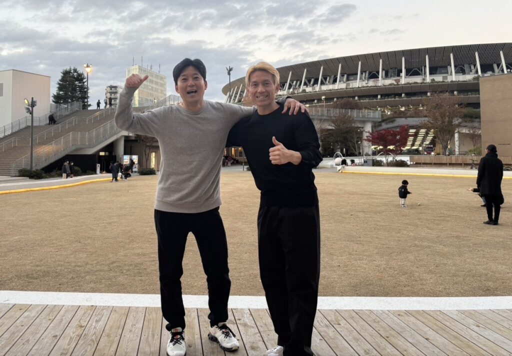 「公園内にサウナ施設ができるらしい」というニュースは数年前に情報入手していましたが、どこの公園でどんなサウナ施設なのかは興味はありつつ、そのままの状態だったんですね。そんな折、僕が川崎フロンターレ時代から仲良くさせてもらっているラフォーレ原宿の荒川社長から「明治公園の中にあるサウナ、TOTOPAの招待券をもらったんだけど一緒に行かない?」とお誘い頂きました。荒川さんはこのサウナブロスの連載※2024年1月24の回にも登場していますが、シニアサッカープレーヤーとして今もボールを蹴り続けているサッカー大好きなお方。荒川さんとはボールを蹴りあうサッカー仲間というより人生の先輩として色々相談したり、荒川さんが持つ人脈、ネットワークから僕の幅が広がりそうな方を紹介してくれる、アニキ的な存在です。