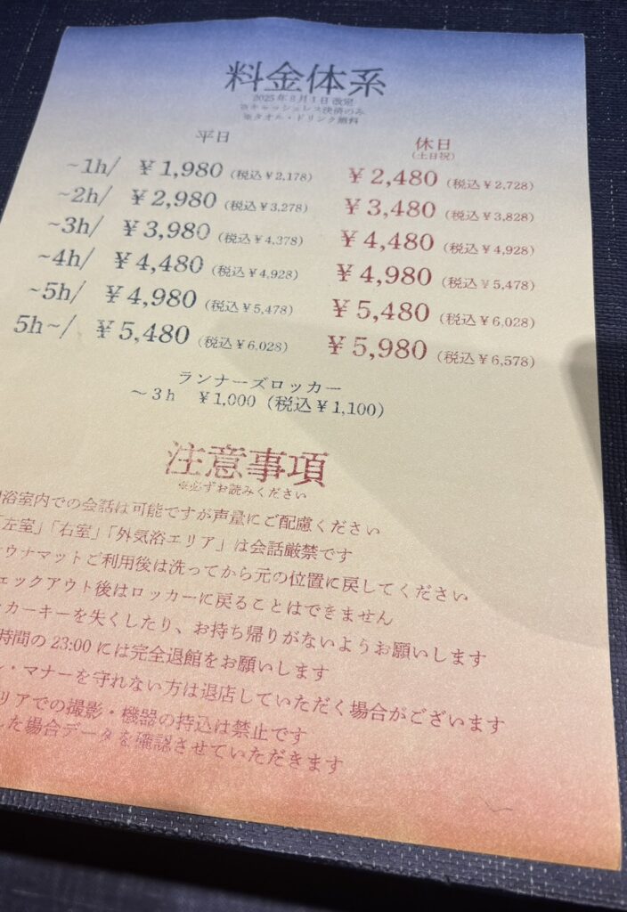 今回は荒川さんが頂いた紙の招待券での入場でしたが、本来は事前にLINEからTOTOPA会員登録をして、退場時に精算する感じです。料金は1時間単位になっており「1時間2,178円」「2時間3,278円」「3時間4,378円」と少しお高め。でもこの後、この金額でも納得のサウナと驚愕付帯サービス&システムがありました。